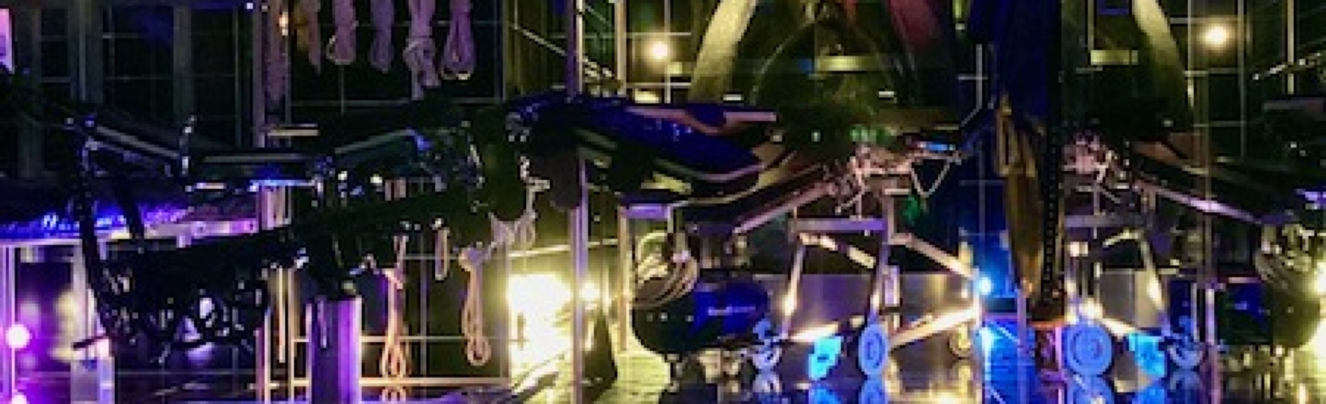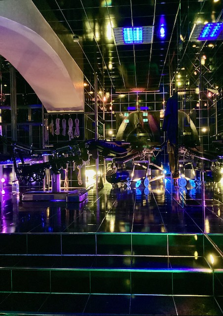 Tritt ein in die schwarze Welt aus Gummi. Indirekte Beleuchtung hüllt das klinische Ambiente in diffusblaues Licht. Starker Gummiduft liegt in der Luft. Glänzend schwarze Kacheln spiegeln jede Einzelheit im Raum verschwommen wider: